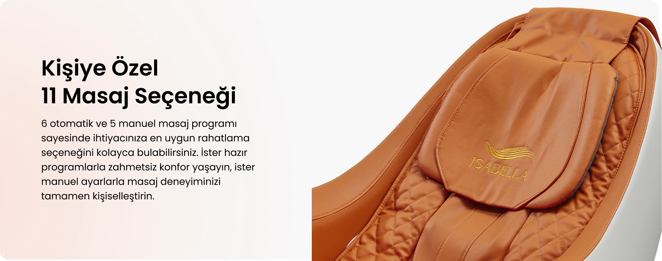 İSABELLA A02 Pro Masaj Koltuğu, omuzdan kalça altına kadar uzanan SL uzun raylı ve çift katmanlı 4 tekerlekli manipülatörüyle profesyonel masör dokunuşu hissi sunar. Akıllı vücut şekli tespiti sayesinde her kullanıcıya özel masaj imkanı sağlar ve sıfır yerçekimi fonksiyonuyla rahatlığı maksimuma taşır. 6 farklı akıllı masaj tekniği ve insan eli simülasyonu sayesinde derinlemesine ve konforlu bir deneyim yaşatır. Kolçaktaki kumanda panelinden programları ve yatış-kalkış pozisyonlarını kolayca ayarlayabilir, bacak masajı için hava yastıkları ve çıkarılabilir başlıkla boyun bölgesi hassasiyetini kişiselleştirebilirsiniz. Şık ve kompakt tasarımıyla ev veya ofisinizde hem estetik hem de işlevsel bir çözüm sunar.