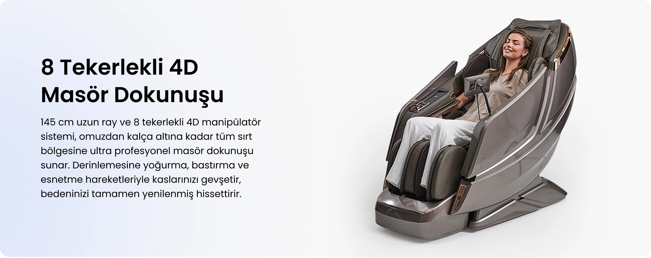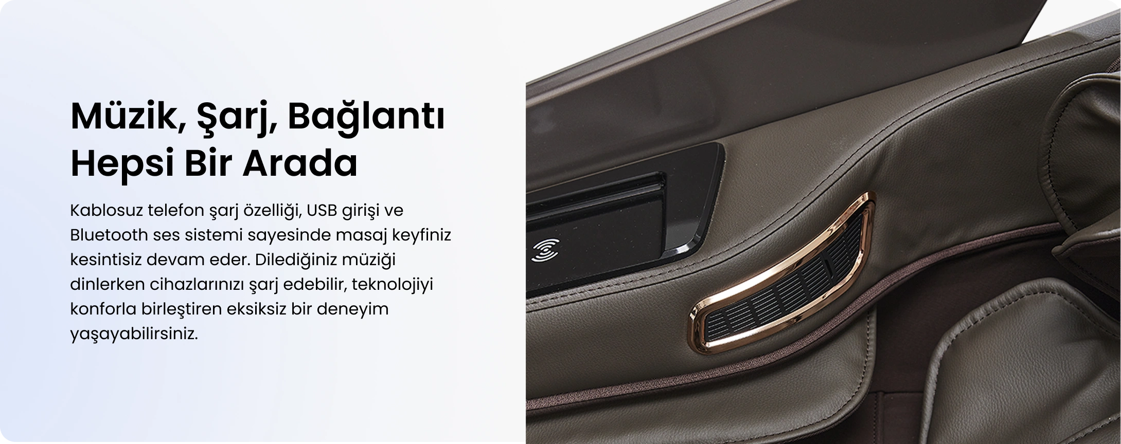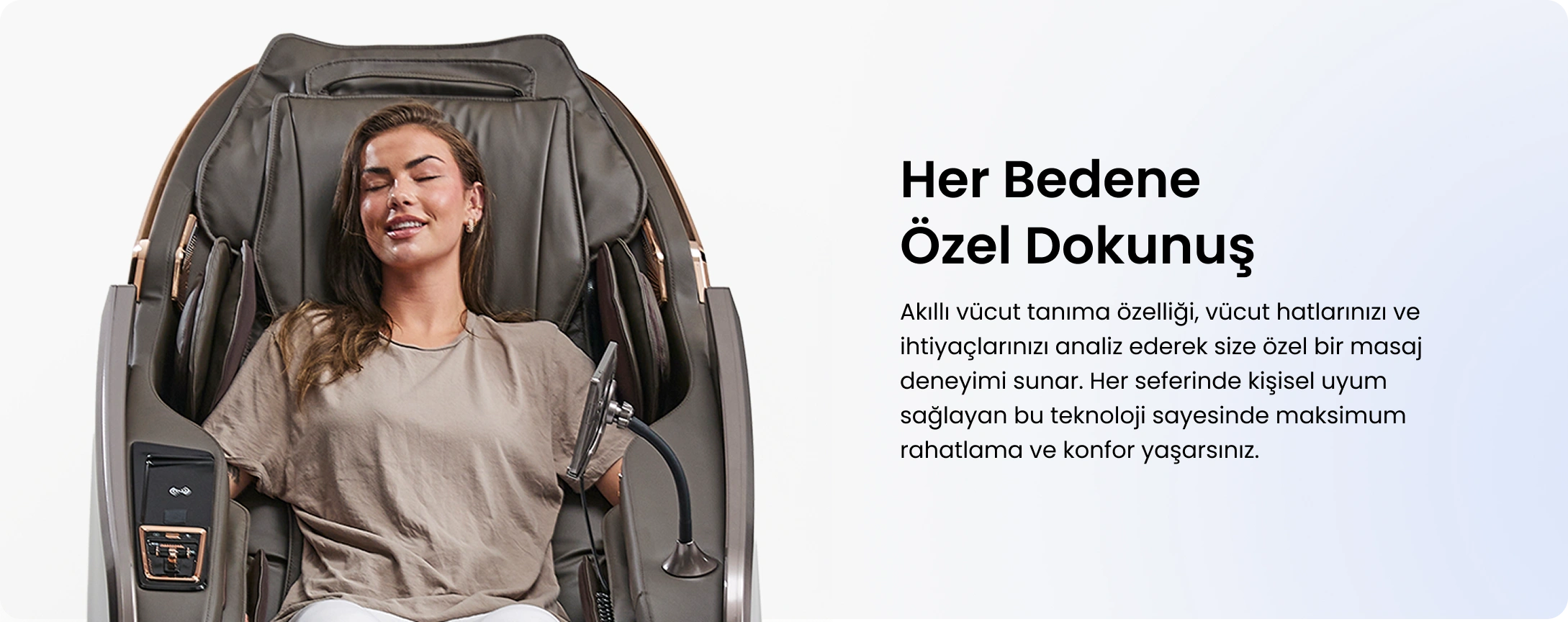 İSABELLA A136 SPECIAL Masaj Koltuğu, 145 cm SL ultra uzun rayı ve çift motorlu 8 başlı 4D manipülatörüyle omuzdan kalça altına kadar ultra profesyonel masaj deneyimi sunar. Akıllı vücut şekli tespiti ve 3 seviyeli sıfır yerçekimi fonksiyonu sayesinde her kullanıcıya özel, üst düzey bir rahatlama sağlar. 24 farklı masaj programı, 6 teknik seçeneği, tay masajı ve esnetme-gerdirme özellikleriyle kaslarınıza derinlemesine etki eder, bel fıtığı riskine karşı destek olur. Ayak altı refleksoloji rolleri, baldır yoğurma ve termal ısıtma özellikleriyle tam vücut masajını tamamlar. Dokunmatik LED ekran, araba tarzı kısayol tuşları, İngilizce sesli komut ve Bluetooth bağlantısı sayesinde hem teknoloji hem de konforu bir arada sunar. Şık LED tasarımı ve kablosuz şarj özelliğiyle A136, ev veya ofisinizde lüks ve fonksiyonel bir masaj deneyimi yaşatır.