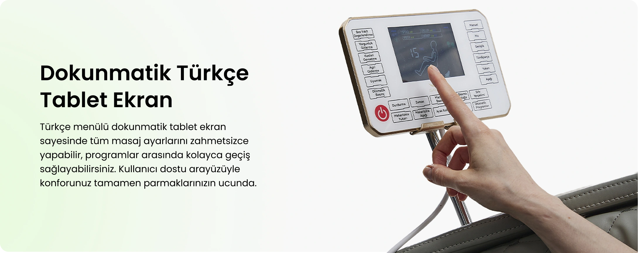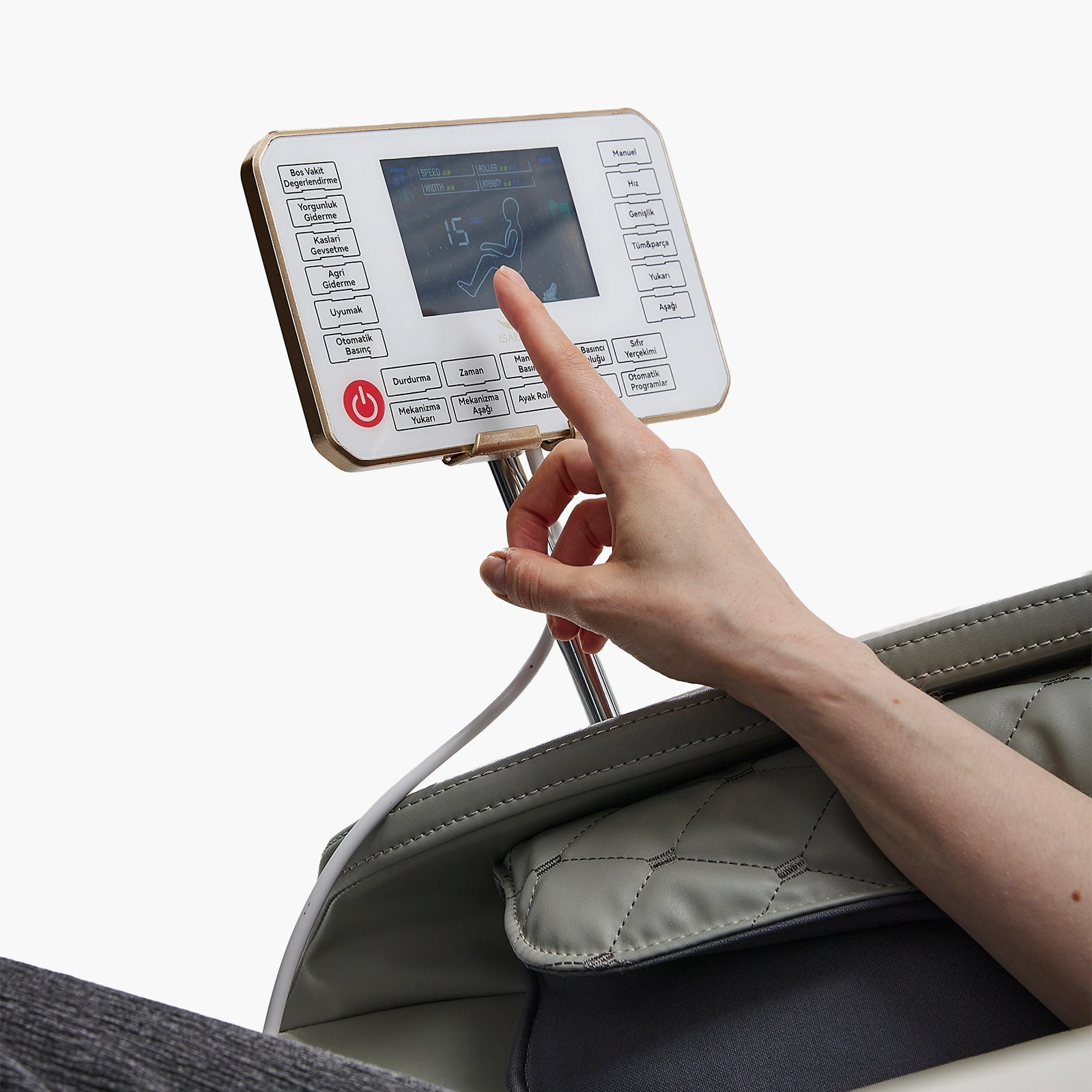 İSABELLA A50 LÜX Masaj Koltuğu, SL uzun raylı ve çift katmanlı 4 tekerlekli manipülatörüyle omuzdan kalça altına kadar profesyonel masör hissi sunar. Akıllı vücut şekli tespiti ve sıfır yerçekimi fonksiyonu sayesinde kişiye özel, maksimum rahatlık sağlar. 18 akıllı sağlık programı, 8 manuel seçenek ve ayak masaj rolleriyle tam vücut masajı deneyimi yaşatır. Türkçe menülü dokunmatik tablet ekran, kısa yol tuşları ve joystick ile tüm ayarlar kolayca yapılabilir. Bluetooth bağlantısı ve USB şarj özelliğiyle müzik keyfi ve cihazlarınızı şarj etme imkanı sunarken, termal ısıtma ve LED tasarımıyla hem estetik hem fonksiyonel bir deneyim vadeder.