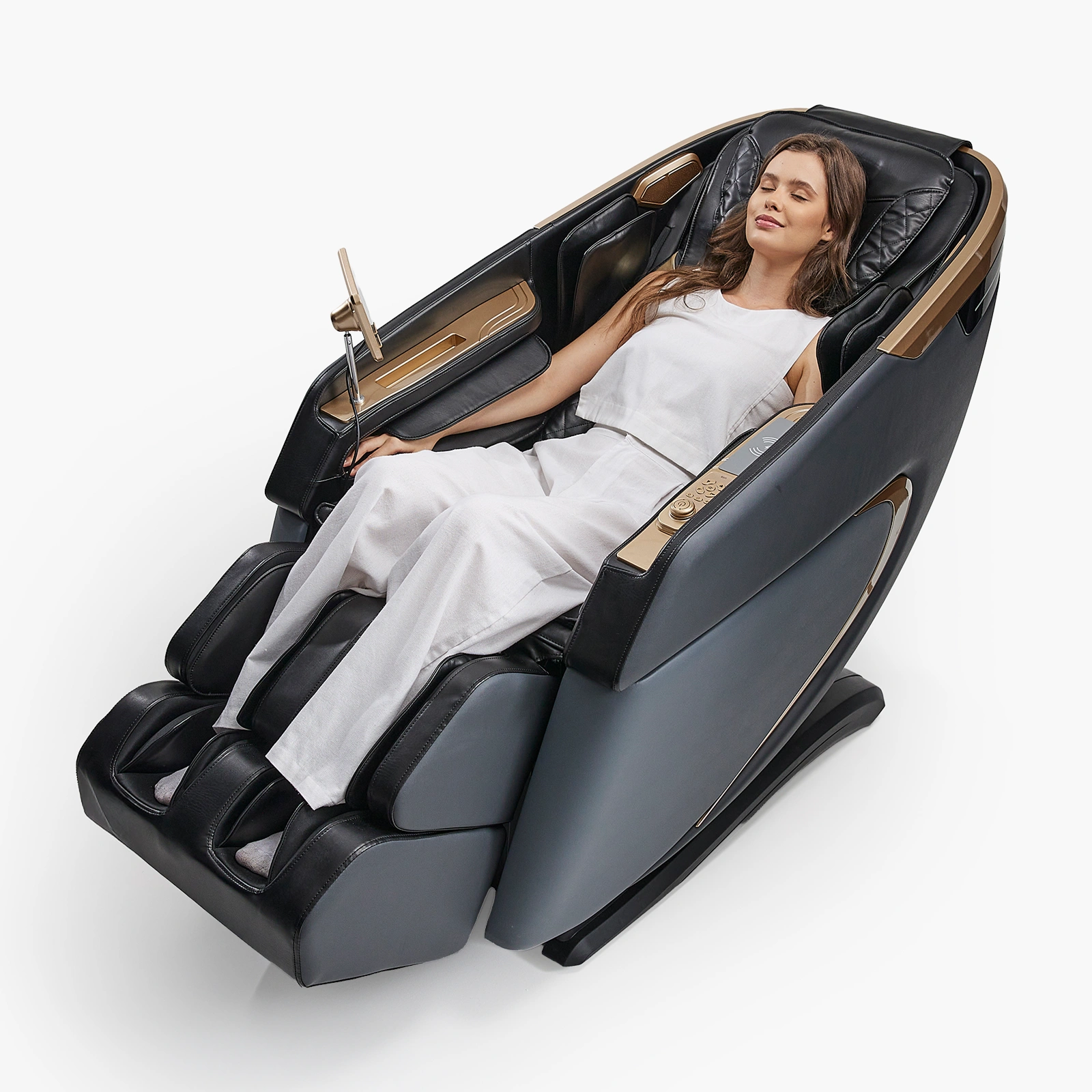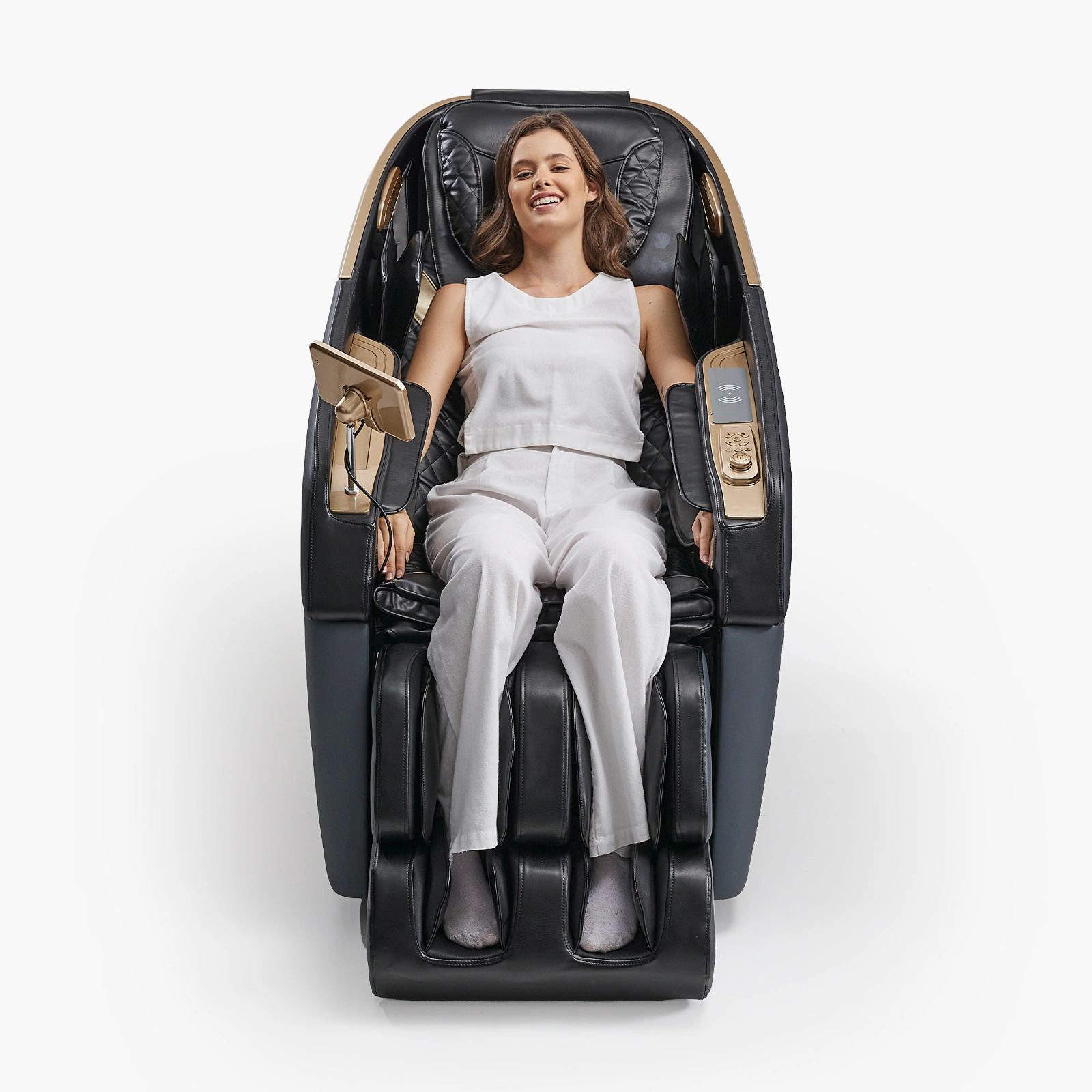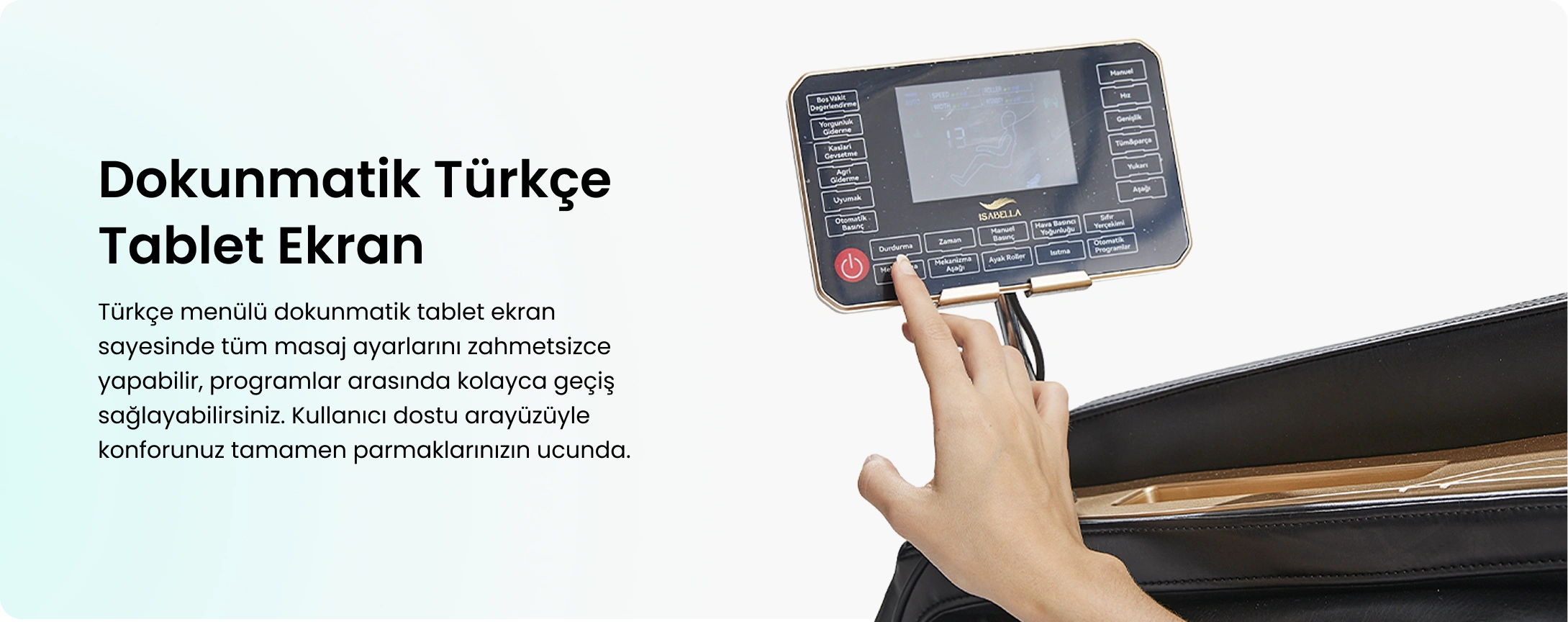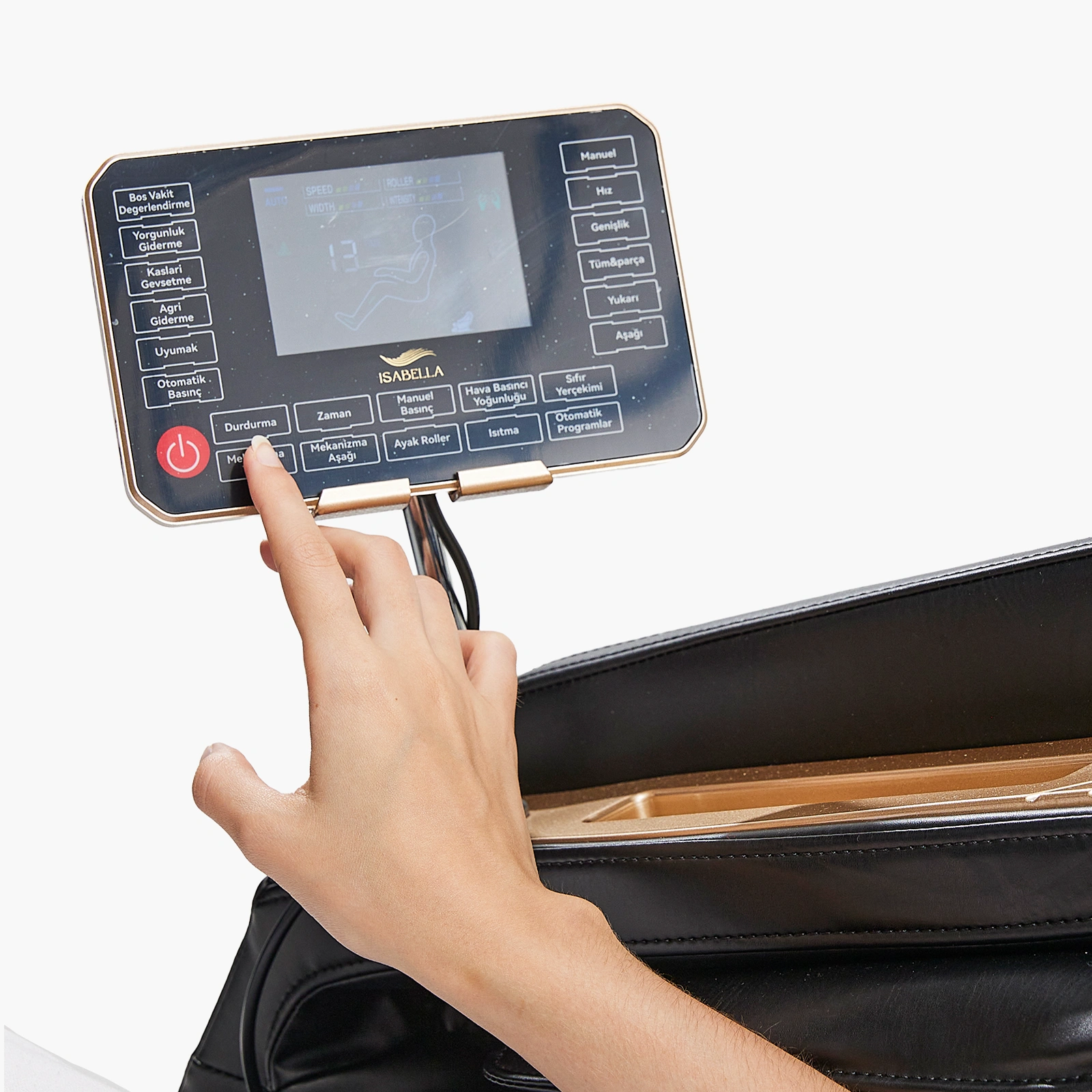 İSABELLA A73 Confort Masaj Koltuğu, SL uzun raylı ve çift katmanlı 6 tekerlekli manipülatörüyle omuzdan kalça altına kadar profesyonel masaj deneyimi sunar. Akıllı vücut şekli tespiti ve sıfır yerçekimi fonksiyonu sayesinde kişiye özel ve üst düzey konfor sağlar. 18 akıllı sağlık programı ve 8 manuel seçeneğiyle her ihtiyaca uygun masaj sunarken, ayak masaj rolleriyle tam vücut rahatlamasını tamamlar. Türkçe menülü dokunmatik ekran, kısa yol tuşları ve joystick ile tüm kontroller kolayca sağlanır. Bluetooth ve kablosuz şarj özellikleri sayesinde masaj sırasında müzik dinleyip cihazlarınızı şarj edebilir, termal ısıtma fonksiyonuyla kaslarınızın gevşemesini destekleyebilirsiniz. LED ışıklı şık tasarımıyla hem fonksiyonel hem estetik bir kullanım sunar.